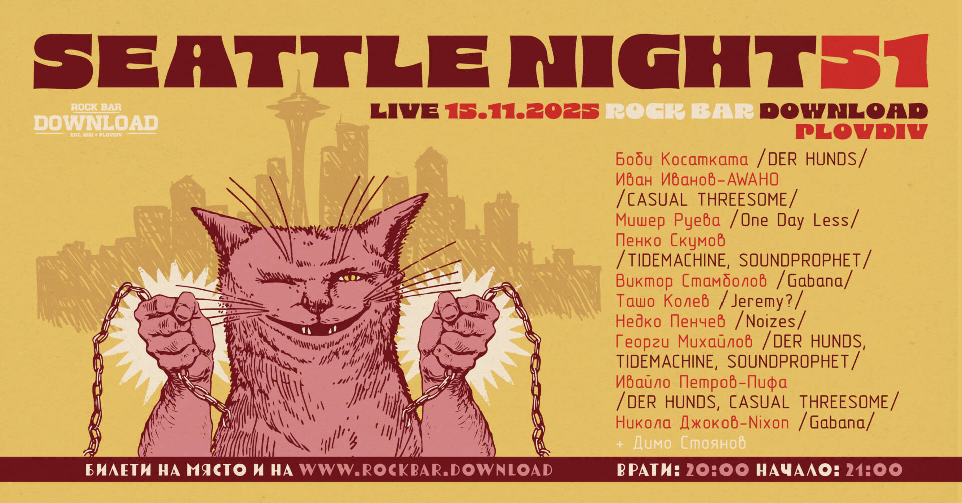 SEATTLE NIGHT 51 @ Rock Bar Download - Plovdiv : 15.11.2025  Традицията продължава с най-емблематичните песни на бандите от Сиатълската гръндж вълна, представени от небезизвестните: Боби Косатката - Der Hunds Иван Иванов…